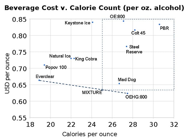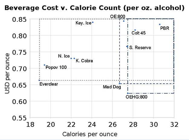 You can see his data graphed below, but either you have to be a graduate student to understand it, or I’m just dumb, cause it all looks confusing to me. It might be easier to just do what I did and read his research paper entitled Get Drunk But Neither Broke Nor Fat. Bottom line, Brian wrote, “I’m about to make a case that Everclear, Mad Dog 20/20 (Grape), and Olde English High Gravity 800 are the only three beverages that matter. And that you should save the Mad Dog just for special occasions.” Dang, I thought people only used Everclear to get a campfire started. Thanks Brian, you are obviously brilliant. With that being said, I think I’ll stick to my Michelob Ultra.