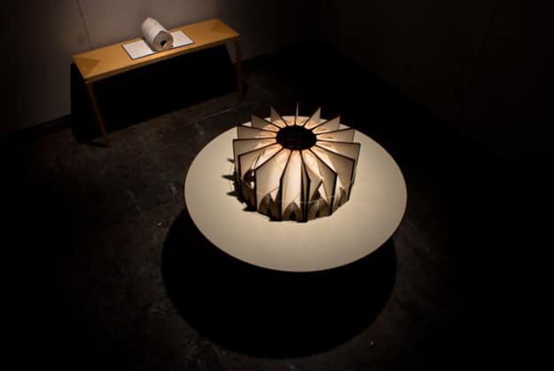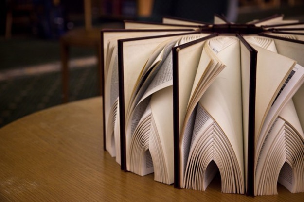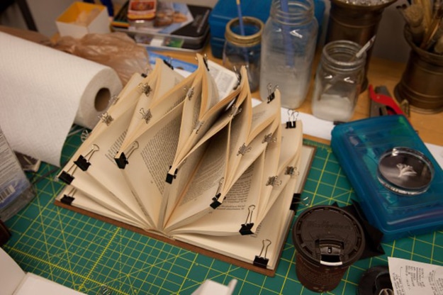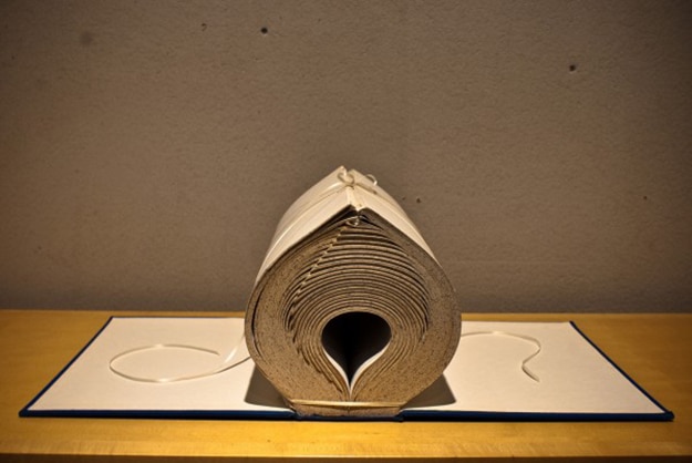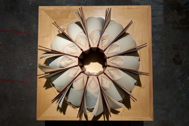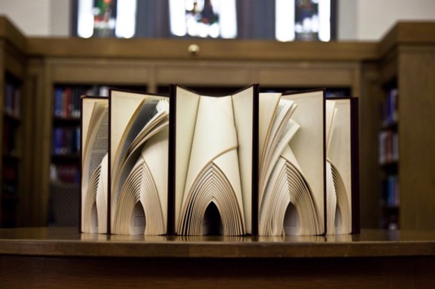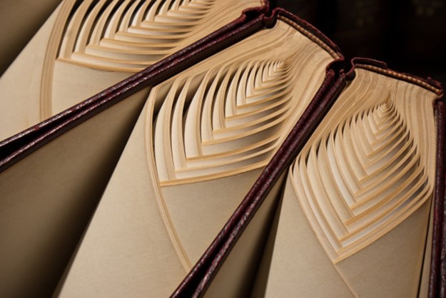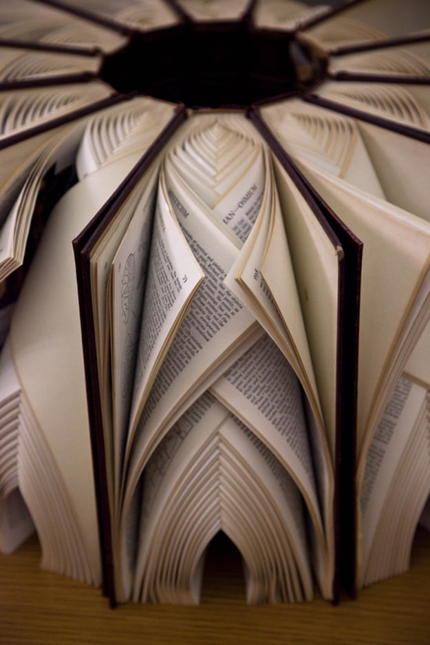 The images have an architectural feeling about them and feel almost like medieval structures like churches or cathedrals. I have seen many types of art using books with the spines, the covers, using the whole book as a brick type medium, and even a range of books that have been cleverly painted. But this is the first time I have seen the pages of books used in such a way.