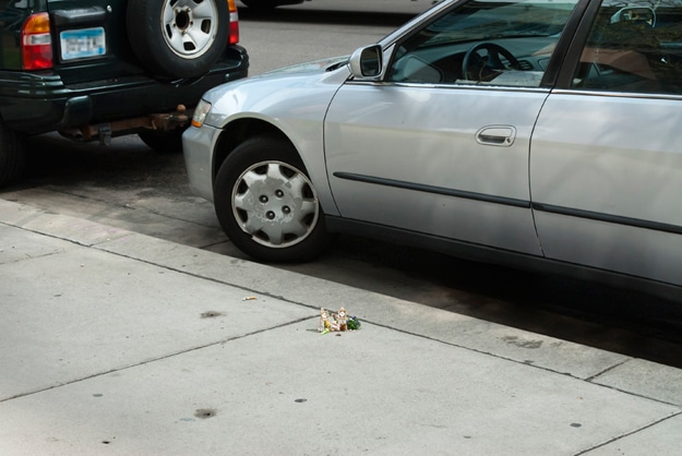 The purpose of this installation is to make people stop, stare, and in that moment become aware of their surroundings. Seeing a dead bug on the street or sidewalk with a little memorial around it suddenly makes everything outside seem more significant and worth seeing. These itty-bitty flowers wrapped in tissue paper and wreaths are so cute. I wish I could find more information about how they make these little miniatures for each memorial. If you want to see how another artist memorializes dead bugs, check out Squished Bugs Peeled From A Car Windshield.