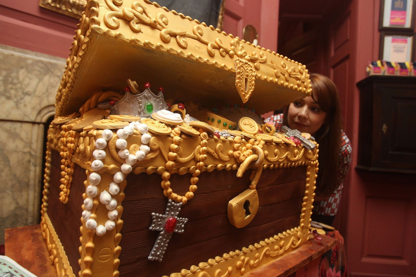 The windowsills are made entirely from fudge. The books on the bookshelf are edible, and even the bathtub is filled with caramel popcorn. The rugs on the floor are made from hand-stitching meringues together, and marshmallow garland is used to decorate the walls. Speaking of the walls, they are partially edible too (with macaroons). There’s even a treasure chest filled with edible pearls and statues made entirely from chocolate and cake.