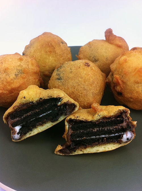 Well, as long as we are going to splurge on these cookies, why not cover them in chocolate and dunk them in the deep fryer for a while? Nick over at Dude Foods has gone where no Oreo cookie lover has gone before. These are deep fried Triple Double Oreos. He wrote, “They sort of puffed out into little balls as they were deep frying, so they ended up almost like doughnuts. The deep fryer also softened up the Oreo cookies and melted their chocolate covering a little bit, which made biting into them almost feel like I was eating a freshly baked cookie that just came straight out of the oven.