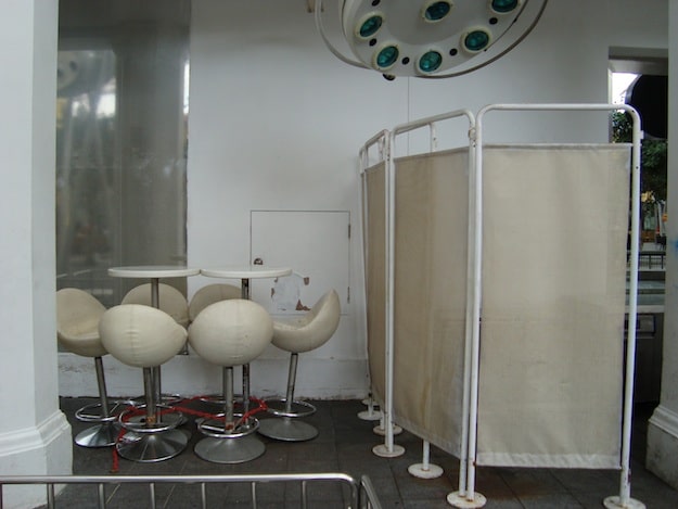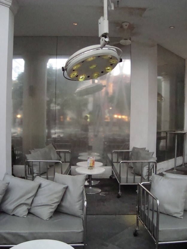 At the Clinic, you could party into the wee hours under surgical lighting, sipping a cocktail like the X-Nurse’s Party (vodka, creme de cassis, lychee liqueur, orange juice, cranberry juice, served in a bucket of 6 shooters), a Sex on the Drip (vodka, rum, blue curacao, peach syrup, raspberry syrup, orange juice, pineapple juice, served in a blood bag), or a Chemical Babies (rum, midori melon, creme de cassis, pineapple juice, orange juice, drops of grenadine, served in 3 unique milk bottles). It appeared to me that all the drinks were available from an IV drip upon request.