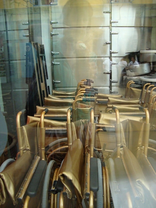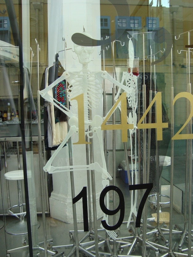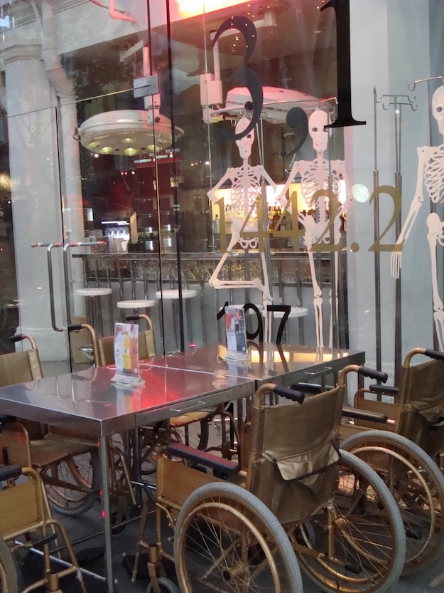 I remember walking over to Clinic before it opened one morning, snapping photos of creepy smiling skeletons resting on IV stands, frozen mid-air, joyous and perhaps ridiculously inappropriate (mocking us for assaulting our livers?). I stared with some trepidation at the line of shimmering folded wheelchairs flashing in the afternoon sun and considered the pack of cheerful blood orange barstools that somehow made the surreal setting light up with the promise of nightly intoxication via blood bag.