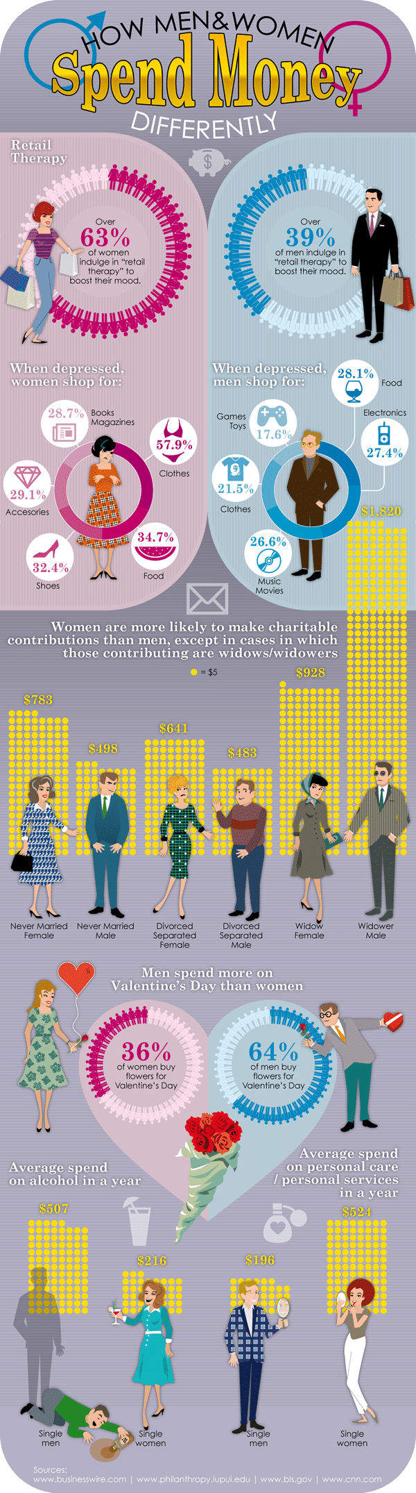 Another thing that stands out quite a bit is that women are more likely to make charitable contributions, except when it comes to men who become widowers. When a man becomes a widower, he spends twice as much money on charitable contributions than any other category of people. Also, naturally men seem to spend more money on Valentine’s Day than women do, which of course isn’t such a surprise. Do you agree with these statistics, or do you find yourself confused since your spending habits are different when compared to those presented in this infographic?
