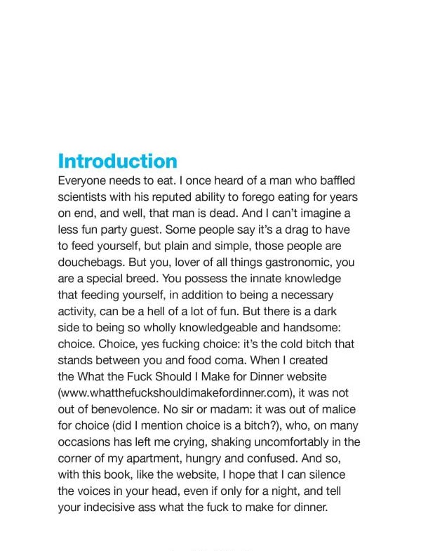 After a lot of searching, I think I have finally found what could possibly help me get this whole endeavor taken care of in just a few seconds. It is the What The F**K Should I Make For Dinner? cookbook. It has the exact name as the question you throw around in your head all day long, and it also has some inspiring and quite edgy suggestions for you when it comes to food.