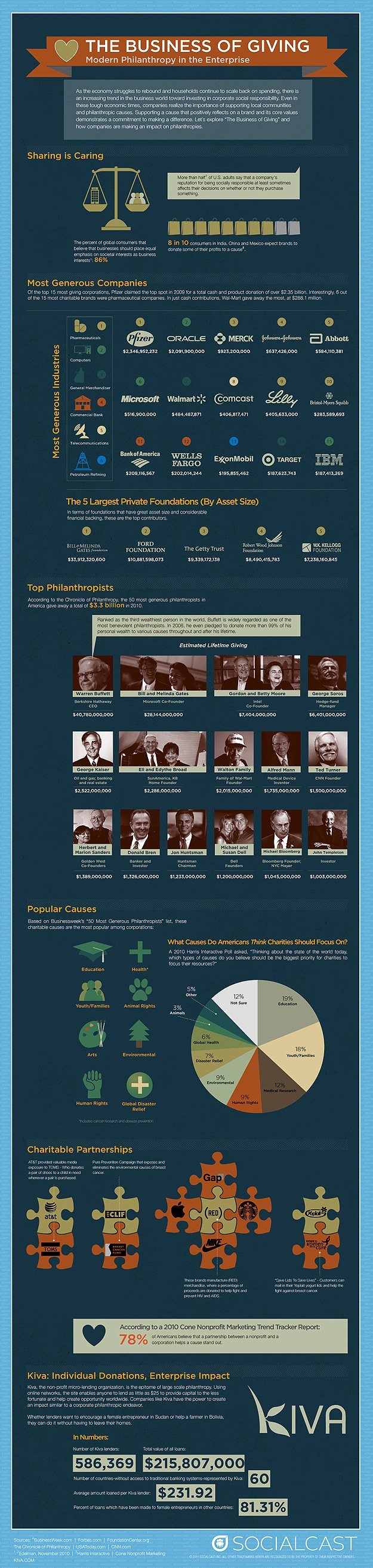 During the tough economic times over the past few years, it’s kind of neat to see corporate giving is on the rise. Many companies have figured out that not only do they have the opportunity and obligation to help those in need, but doing so impacts consumer spending on their brand in a positive way. It’s truly a win-win in every aspect, and it’s a beautiful marriage between the business of making money and the business of giving it away. This infographic by Social Cast illustrates the most recent information available about who’s giving what to whom. Will reading this affect how you spend your money? I know it makes a difference to me when I know a brand or corporation is behaving in a socially conscious way.