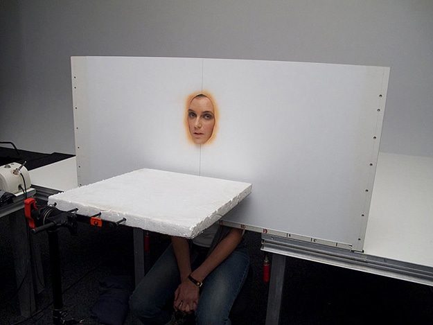 It took them nine hours of applying makeup nonstop to complete this photo shoot. They used 7 bottles of foundation, 2 bottles of eye makeup, 3 lip pens and 2 bottles of blush. The model, who had to remain with her face in this construction panel the whole time, could only eat and drink through a straw during the shoot. I bet she got some serious zits after having all that crap on her face for so long. You can learn more at Lernert & Sander.