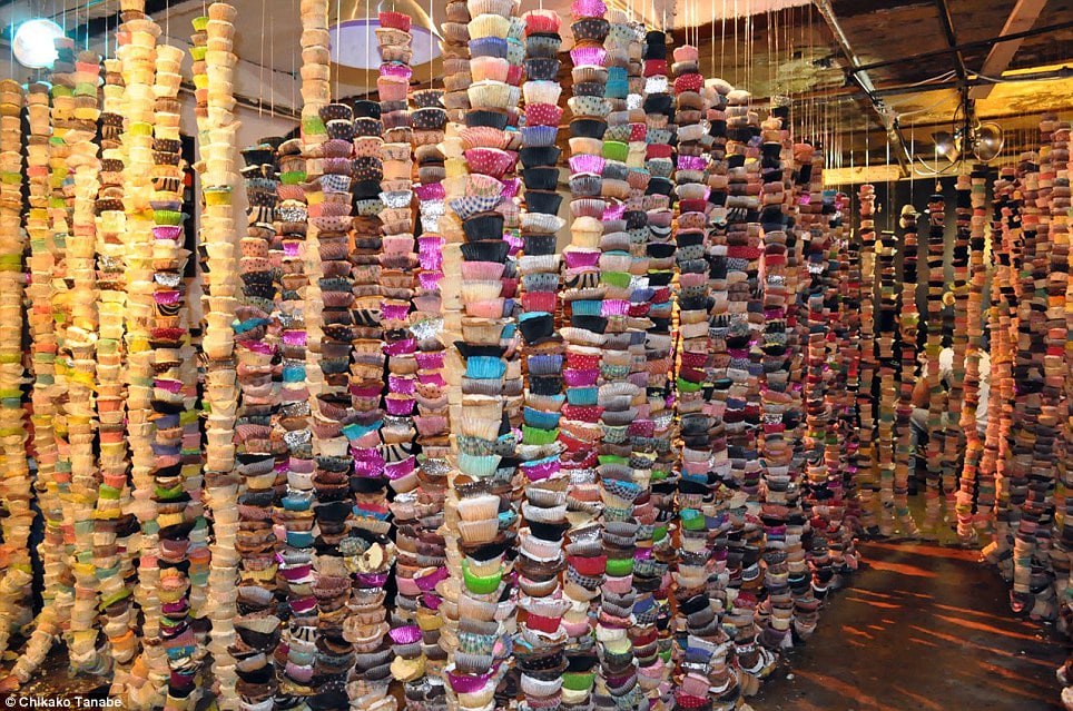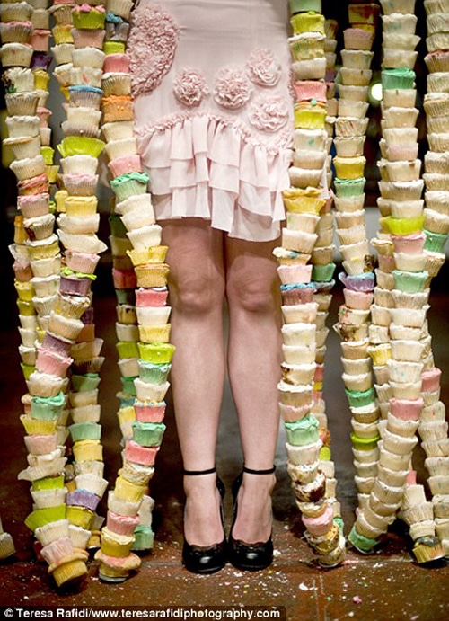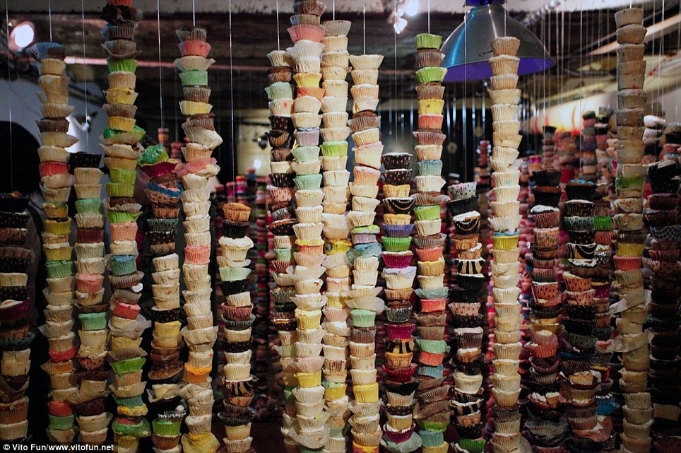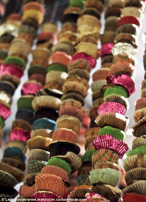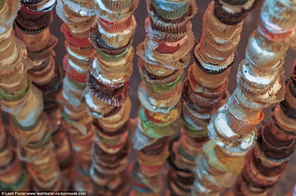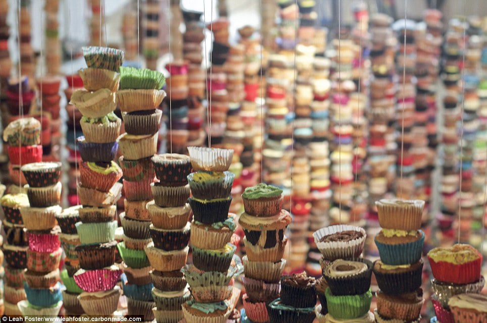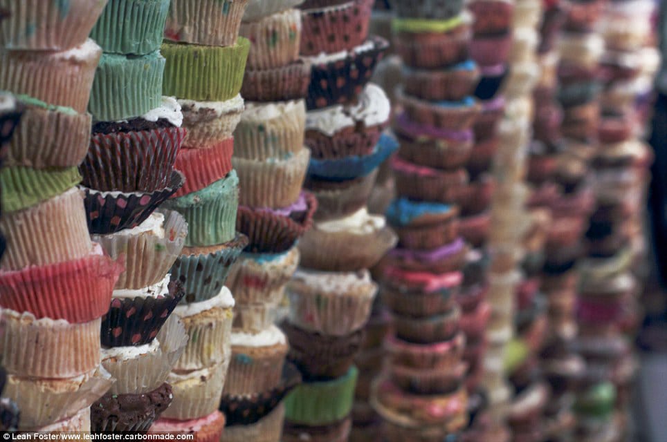 The cupcake tower you see below is called her “Muffin Tops” installation, and it was set up in Manhattan for a while. The other 3,000 cupcakes were for a project in Dallas. As with all art installations, there is a deeper meaning behind this one. Leah is no stranger to baking cupcakes, and she started to notice that even though she’d bake them often, she would never eat them. Upon further refection, it of course all came back to the fact that she didn’t want to gain weight because she wanted to conform to society’s image of what a beautiful woman looks like. But then she realized, what is life without indulging in a few cupcakes every now and then?