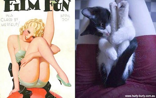 Now, back to the cats…I have so many questions about this. Are these random, bizarre shots of cats that someone meticulously matched with pin-up girl photos? Are the cats specifically posed to match a certain photo? How do they get the cats in mid-air like that? Does someone throw them up and then photograph them? Are some of these Photoshopped? I may never have the answers to my questions, and maybe I’m over analyzing it. Maybe I should just settle for the fact that it’s a daily cute and let it go. If you have a cat who likes to pose all sexy like a pin-up girl, you can submit your photos on the site. They say they’ll try their best to use them.