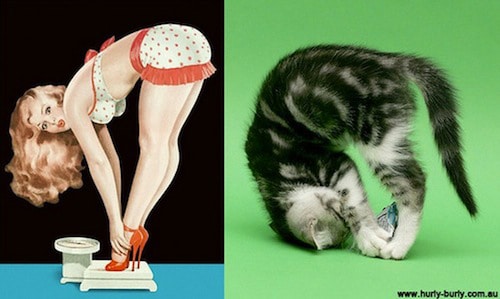 It’s “daily cute” time, or “daily wtf” time – I haven’t decided which one this is yet. Retro pin-up girls in different art forms have been really popular this year, and I suppose this is a take off on that. I don’t have any cats, and I’m not even really a fan of cats, but I have to admit these little cuties are adorable. These are cats posing in pin-up girl positions. From a creativity standpoint, it’s quite brilliant that these pictures can be matched up so perfectly to these classic pin-up poses.