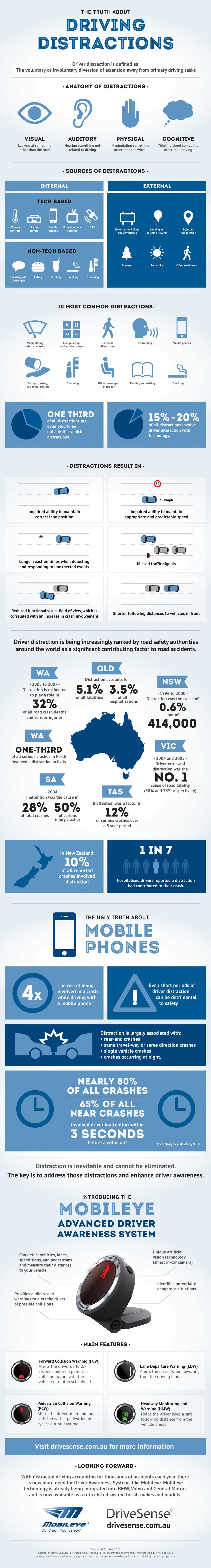 I’m the first to admit, I’m a bad driver. If I’m not 100% paying attention to my driving, there is a good chance I’ll bump into something with my car. Thinking about all this prompted me to write about driving distractions today. This infographic called The Truth About Driving Distractions by DriveSense breaks down the four types of driving distractions we all encounter pretty much every day. There are visual distractions, auditory distractions, physical distractions and cognitive distractions (yup, even thinking about something other than driving can be one of our driving distractions).