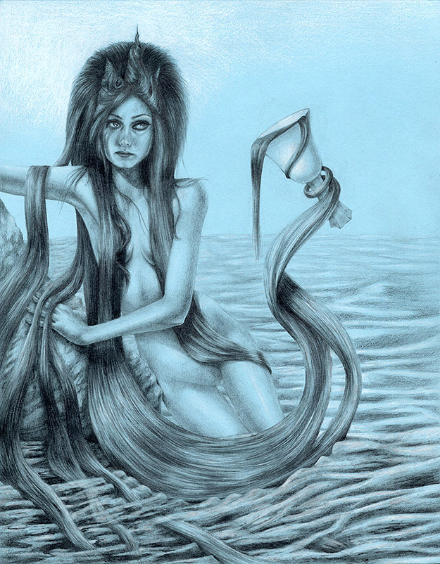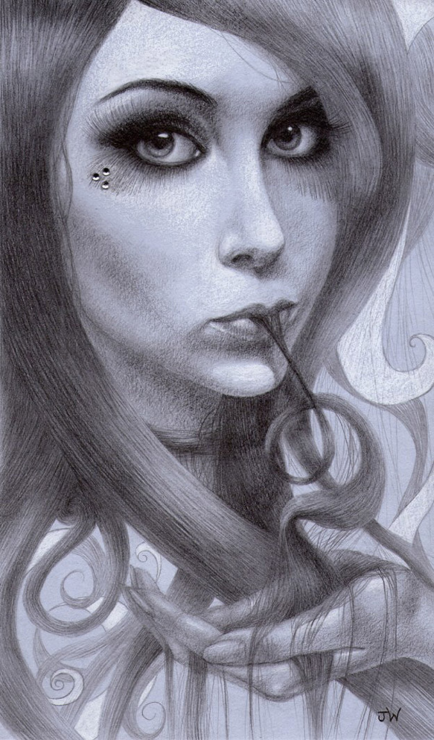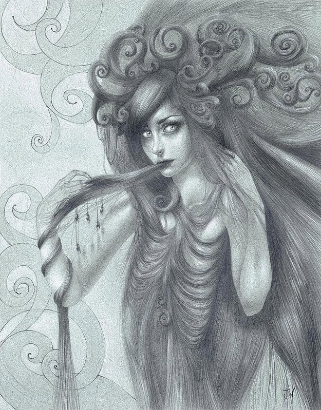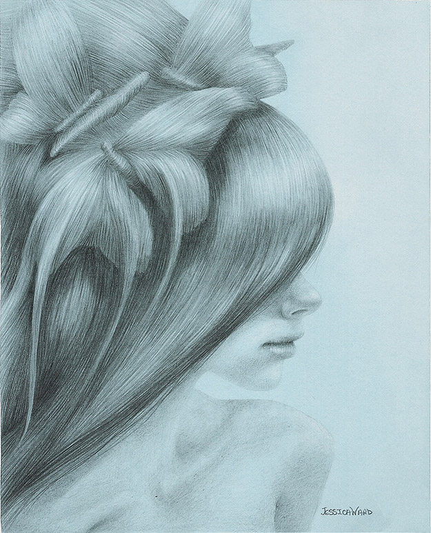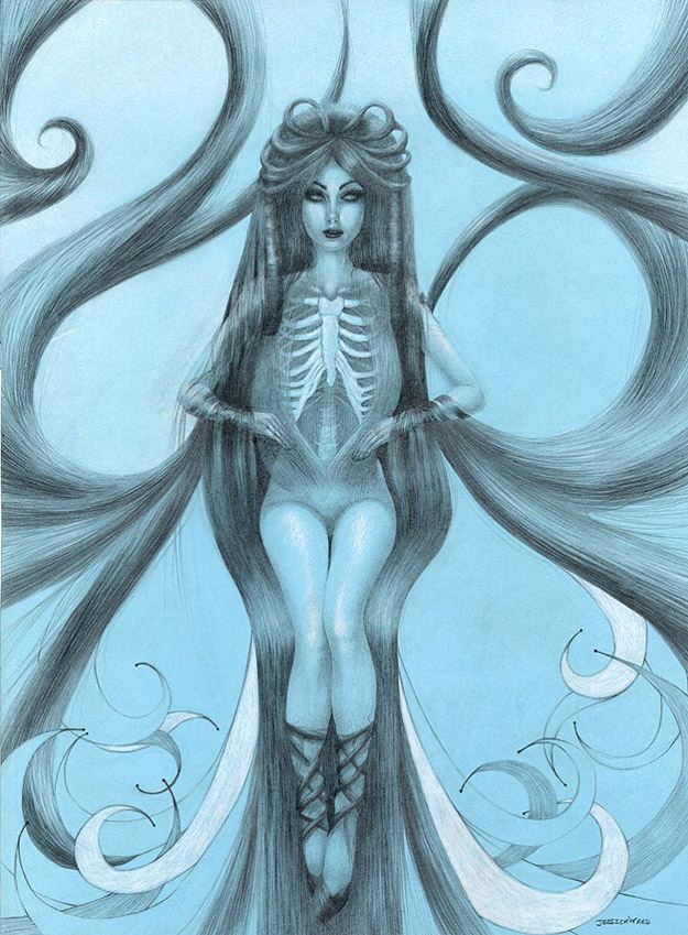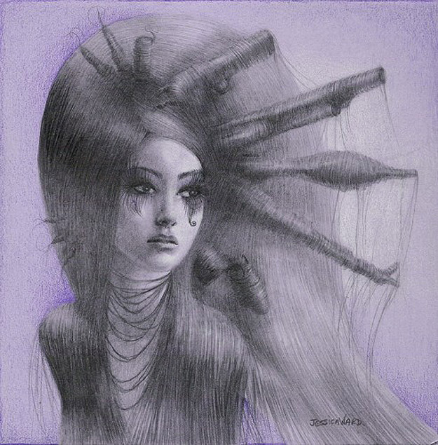 Jessica Ward’s work directly faces body issues like Anorexia and Bulimia. As you see, hair is a focus in her artwork. In an insightful interview with Jessica on Wicked Halo, she says that “hair became the visual representation of eating disorders” for her. She also says, “it’s hypnotic and once you’re in it, you can’t get out.” I want to send a shout-out of love to anyone going through this experience. I hope you enjoy these illustrations as much as I have. These are all done in graphite and colored pencils. You can learn more about Jessica on her website here.
