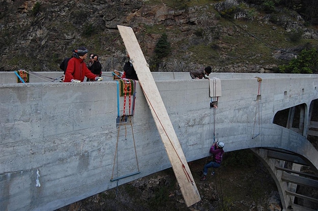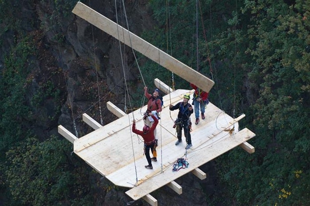 This particular mission was when the group set up a homemade Jacuzzi over the side and 187m below the Gueuroz bridge in western Switzerland. I tried to position the pictures in a progression so you could get a feel for the whole process. I’m not trying to be a smartass, but what’s the purpose of the helmets? I mean, if you fall from that high up, is a helmet really going to help? The more I look at these pictures, the more I think I might try it. Of course, I would only do it if I was wearing a parachute. I’ve heard of people getting in a hot tub naked but never with a parachute. Maybe I could start a new trend. You can see more pictures and learn more about this extreme sport on jaccuzzi.ch.
