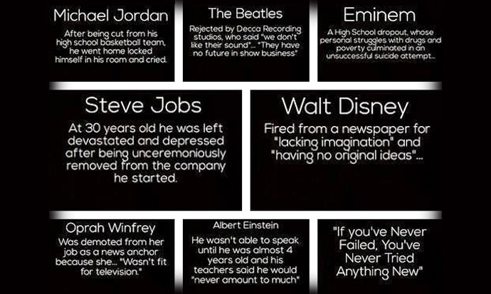 The little chart below called “Famous Failures” is another oldie but goodie that’s been floating around the web for a while. I found traces of it from all the way back in 2007, and I’m still not sure who to credit for creating it. Like most timeless pieces like this, it gets popular, then it dies down, then it gets popular again, then it dies down, but it never gets old. This is making the rounds once again, and this time, I wanted to share it with you. I also put a quote below from J.K. Rowling. Her story is truly inspiring, and if you don’t know it, I encourage you to look it up and read it. Of course, she was the first person to become a U.S. dollar billionaire by writing books.