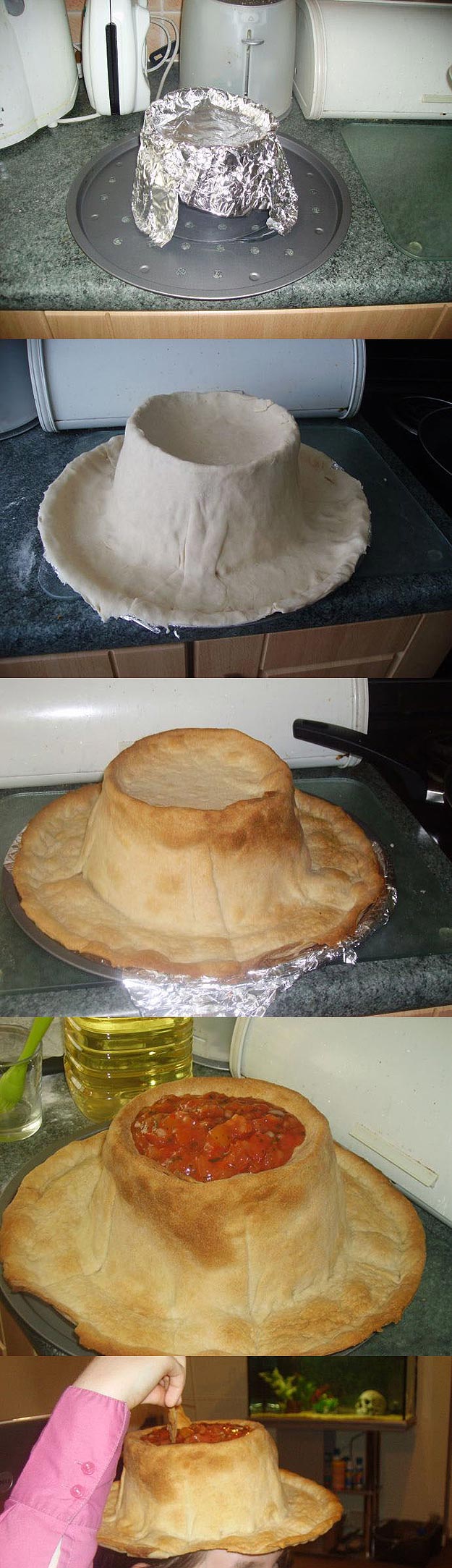 Or, you can do what any self-respecting geek would do and realize that you are in fact a geek, and you will inherit the earth. Nothing is outside the realm of possibility for you my friend. You can make it happen. All you need to do is cook up a hat made out of dough. Just make sure the top has a little bowl carved out, and voila, you now have your portable salsa dish to take with you anywhere! Heck, the bowl looks kinda tasty too.