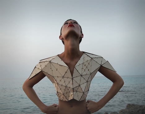 This quite interesting idea comes from French designer Pauline Marcombe, and it is a look at what a creative mind can come up with when the ordinary has become boring. Her approach is to use wood as her main material, and she links sheets of it together into a form that fits just about anyone. Future t-shirts will of course have to be tailored to each and every person, but what does that matter when you will get your very own protective layer to guard you against whatever may cause you harm?