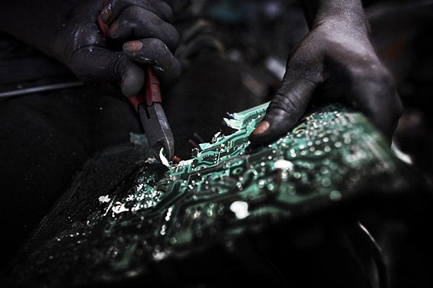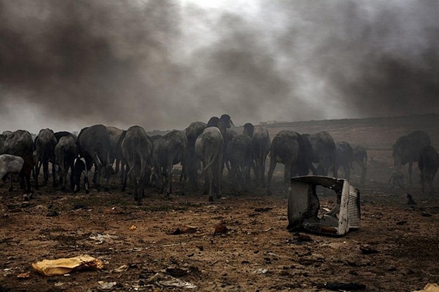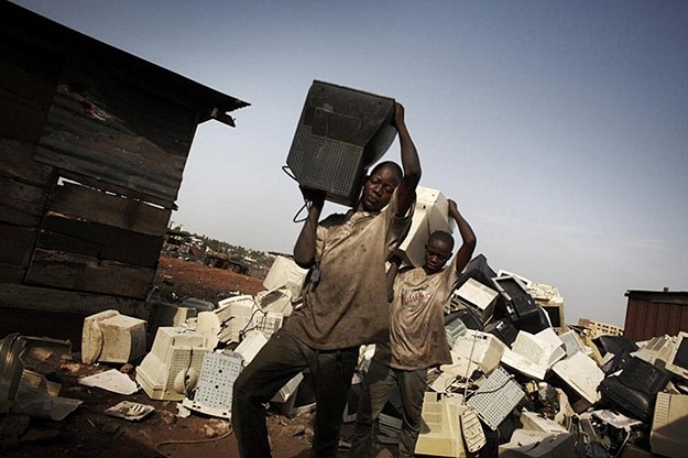 The whole area is polluted beyond belief. Toxins like lead; cadmium and mercury in this area are in concentrations greater than 100 times what is considered normal. Black smoke can be seen for miles, and the nearby river has computer keyboards and other electronics floating in it. Children walk through the waste without shoes and search in the burning metal with their bare hands to hopefully find something they can sell.