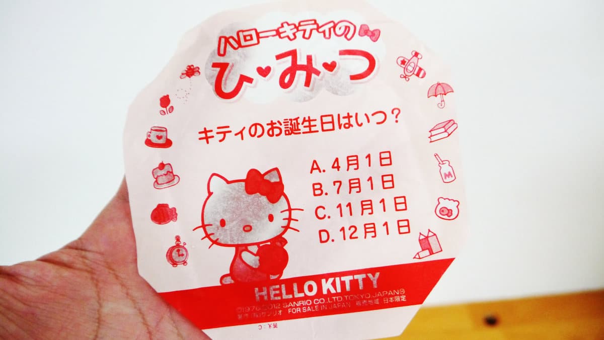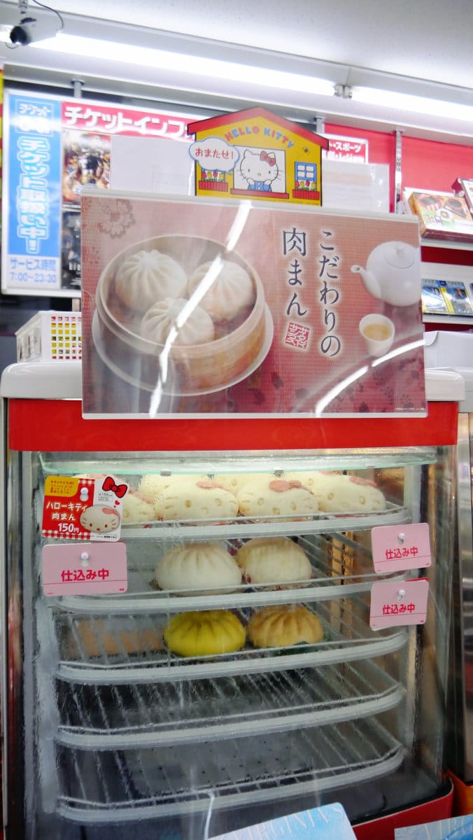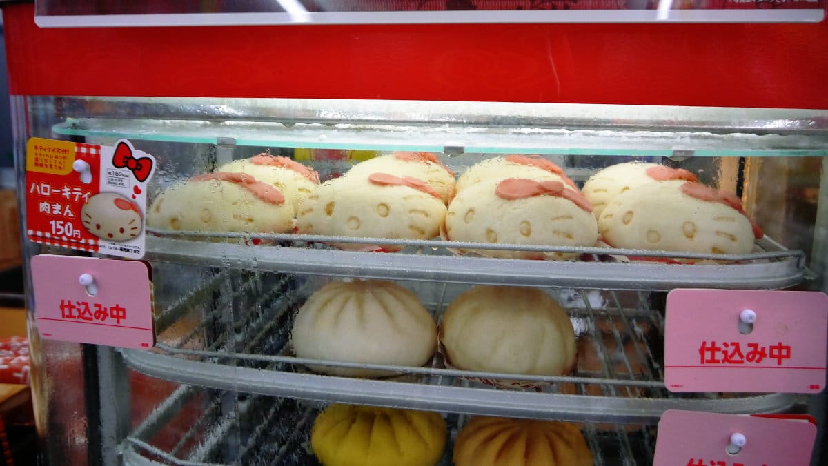 I’ve eaten baked buns similar to these before, and they are quite tasty. The red and white paper you see on the bottom of each baked bun is a little Hello Kitty quiz. It asks when Hello Kitty’s birthday is. Do you know? In these pictures, you can see the store where they are sold, and how they are displayed. Apparently they are going to be offered in more locations soon. I would like to make some of these myself. Instead of putting meat inside, I’d put some strawberry jam, Bavarian cream, Nutella or something else sweet.
