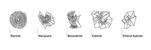 The spiders were drugged up with marijuana, caffeine, Benzedrine and Chloral Hydrate. Then, they were set free to make their webs. Obviously, the results of the drugs showed in the webs themselves. According to Treehugger, the drugs affected the spiders in different ways. For example, marijuana affected their concentration, as evidenced by that web being unfinished. Caffeine pretty much just made the spider crazy and the web is all unorganized and disrupted. Benzedrine, a stimulant, gave the spider a lot of excitement and energy, as seen in that very busy web. Chloral Hydrate, a sedative, caused the spider to fall asleep before finishing his web.