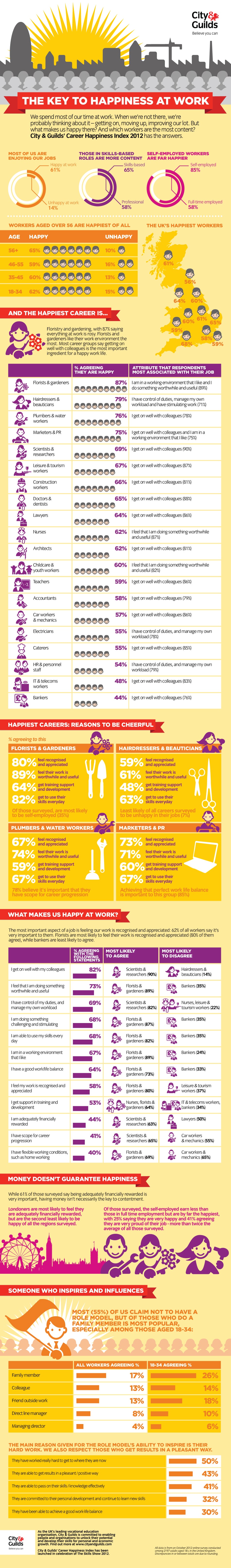 The question is – what exactly makes us happy at work? Would simply having a job we love do the trick? Does it take more than that? Is it all about making a lot of money? This infographic called The Key To Happiness At Work by City & Guilds shines a little light on this topic. They surveyed 2,197 workers in the UK to determine what factors most affect happiness at work. It also lists the professions where people are most likely to be happy at work.