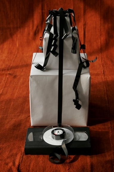VHS Video Tape Wrapping: Simply reach within the old and battered VHS tape and roll it out. Use the tape to create ribbons and shiny wrapping, and you will have yourself a retro wrapping worthy of a true geek.