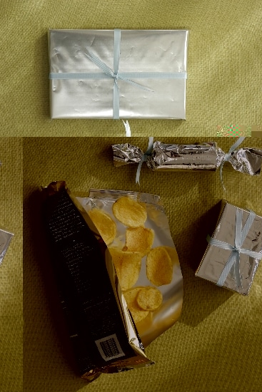 Chips Bag Wrapping: After enjoying a bag of chips, you are left with a bag that you usually just throw away. Why not turn it inside out, clean it and use it as wrapping for your gifts? Never have your presents looked so glistening shiny. The geeky revealing of the wrappings inside will be a second leg to the thoughtful present.