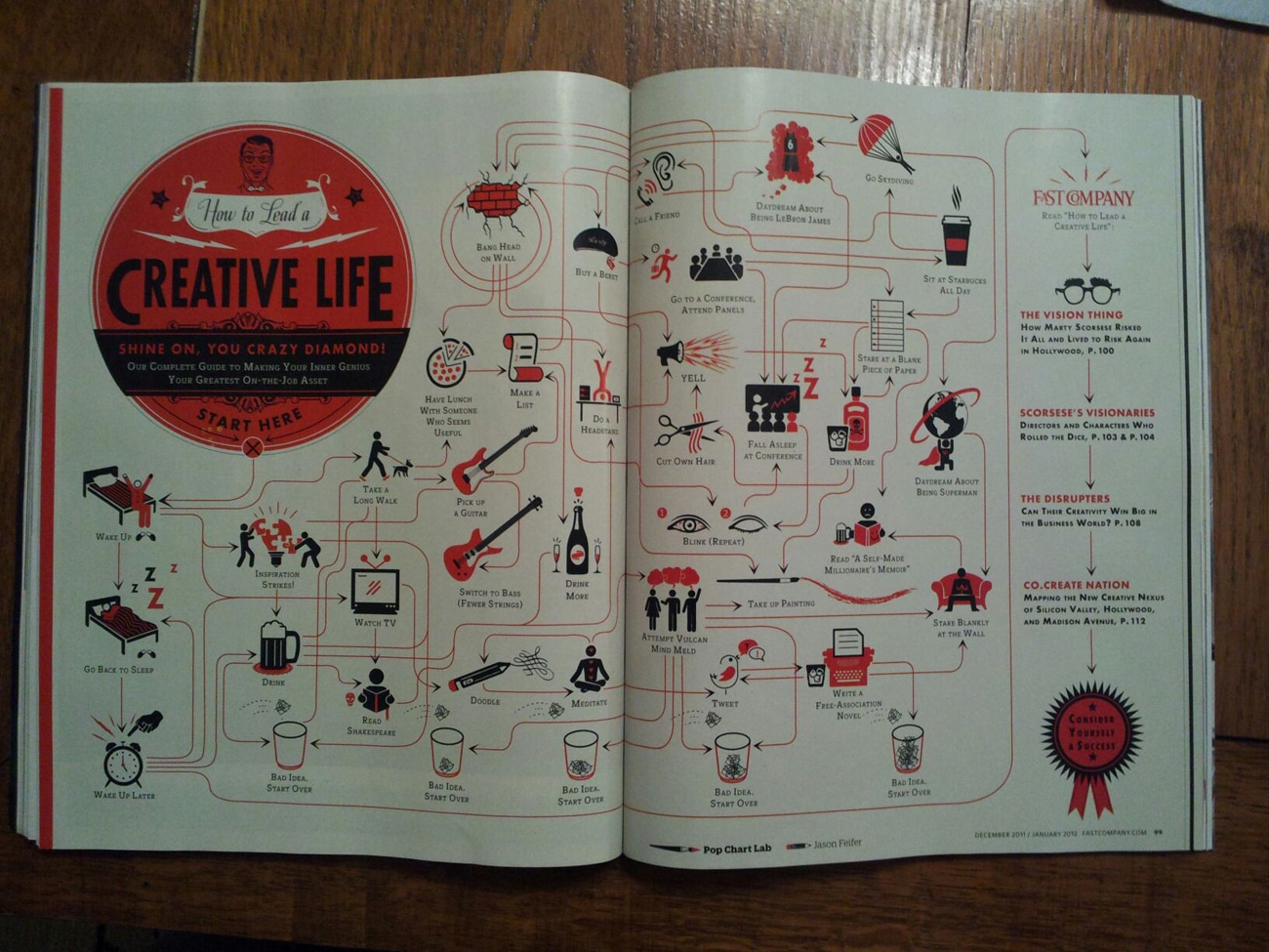 If found this cheeky infographic called How To Lead A Creative Life which comes from an old issue of Fast Company (see the magazine below). It’s full of fun things that creative people might do during the day. The reason I like this so much is because it screams one message to me…Don’t take yourself so seriously. Like this infographic points out, if we can daydream about being superman, attempt a Vulcan mind meld and even sit at Starbucks all day and work, we are going to be just fine.