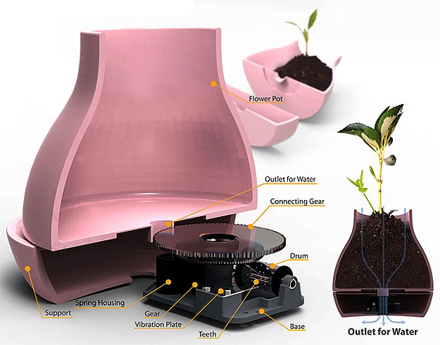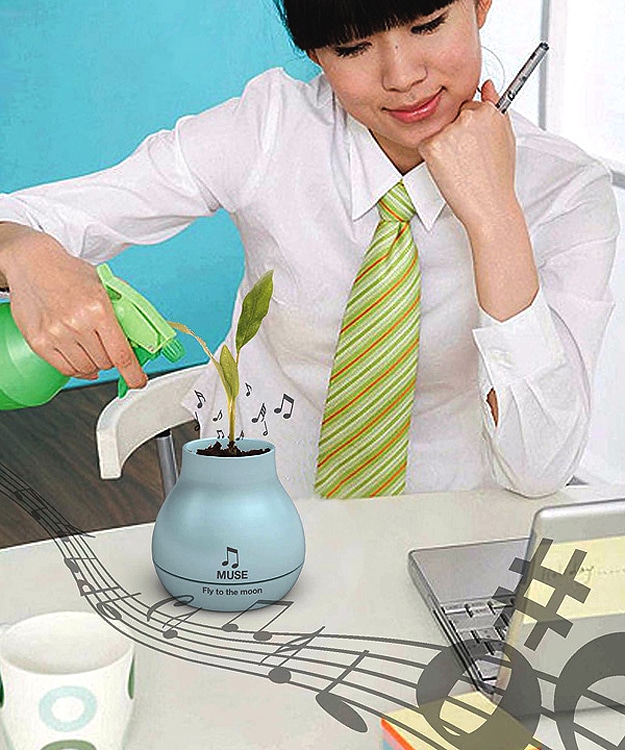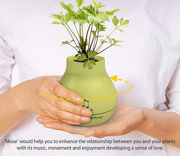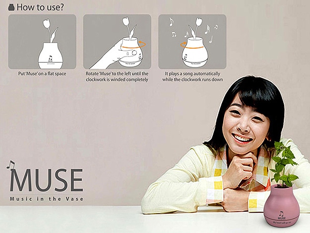 Lie Zhong-Fa, Koo Yoori and Jeon Se-Yong, the creators of this musical vase, obviously agree with this theory. It’s a vase that sings to your plants (and you). To make it work, simply wind it up, like a wind up toy, and enjoy the music until it runs out. Then wind it up again. Each colored vase plays a different song. As you see in the picture below, Muse helps you to “enhance the relationship between you and your plants with its music, movement and enjoyment developing a sense of love.”