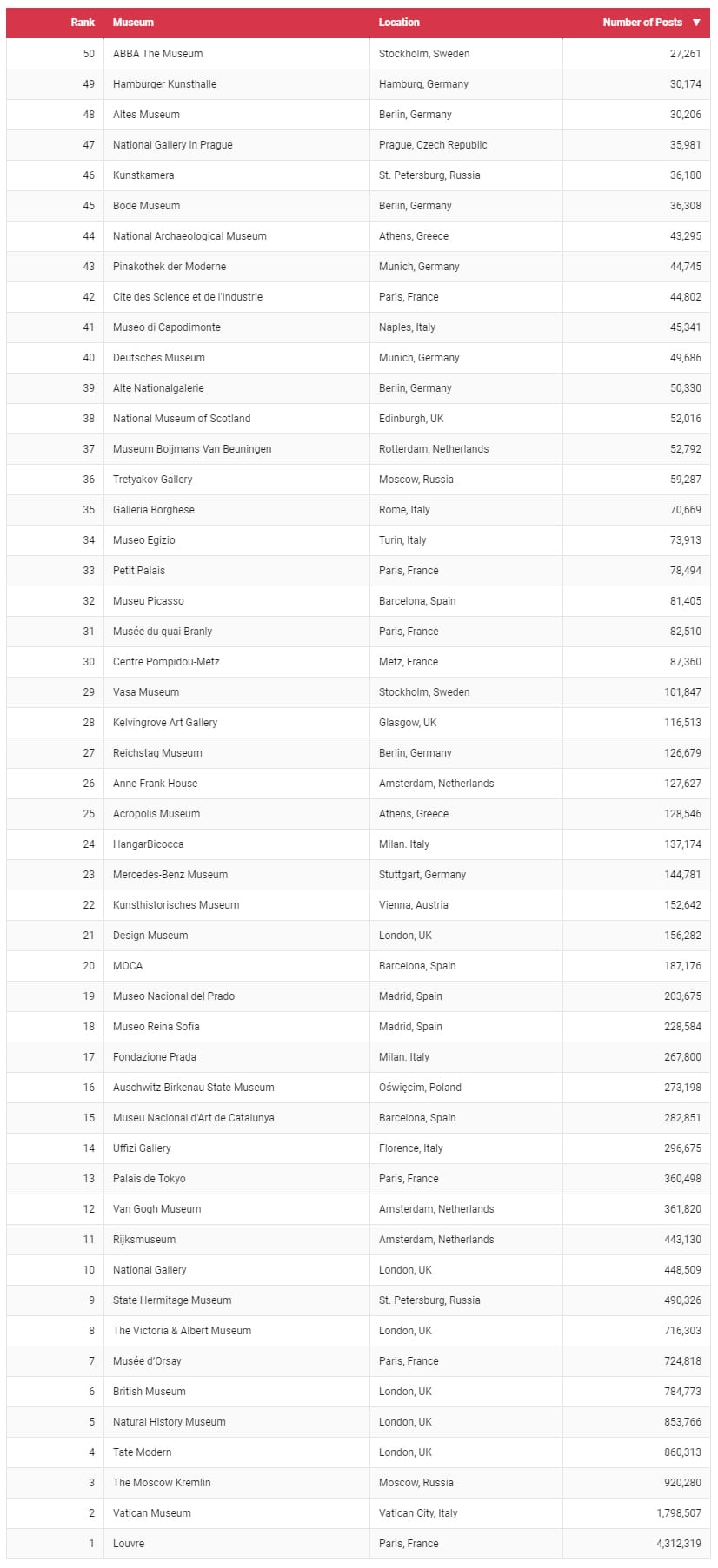 Five of the top ten museums shared on Instagram are located in the iconic city of London. The Tate Modern isn’t just a museum, it’s an architectural gem on the banks of the Thames. Combined with the likes of the Natural History Museum and the Victoria and Albert, London is filled with masterpieces and antiquities of all kinds. People are taking trips to this historic city and its array of venues and sights, and Instagram users can’t get enough of sharing their museum experiences online.