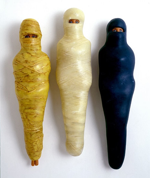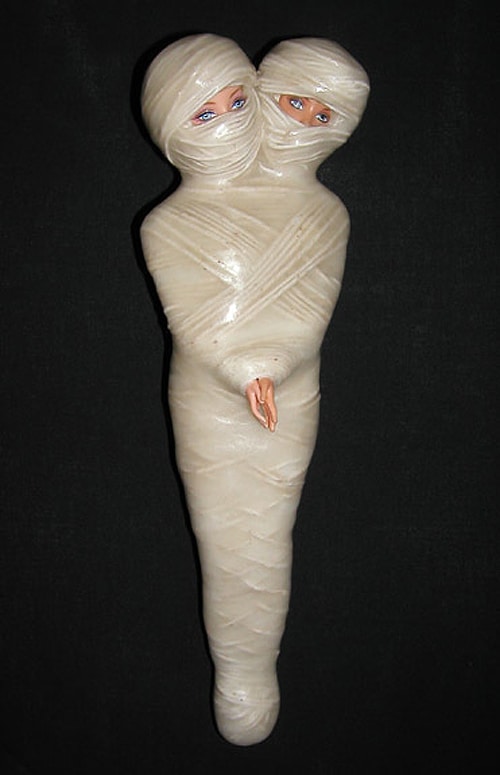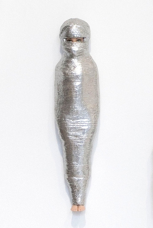 These are mummified Barbies who are turned into mummies with beeswax, twine and silver chrome flakes. Artist E.V. Day says they represent how American female culture is obsessed with preserving beauty through whatever means necessary. These are playful and fun, and I definitely want one. Too bad they cost $3,500 each. If you’ve got that kind of dough to drop on a Barbie doll, you can buy one at Grey Area.