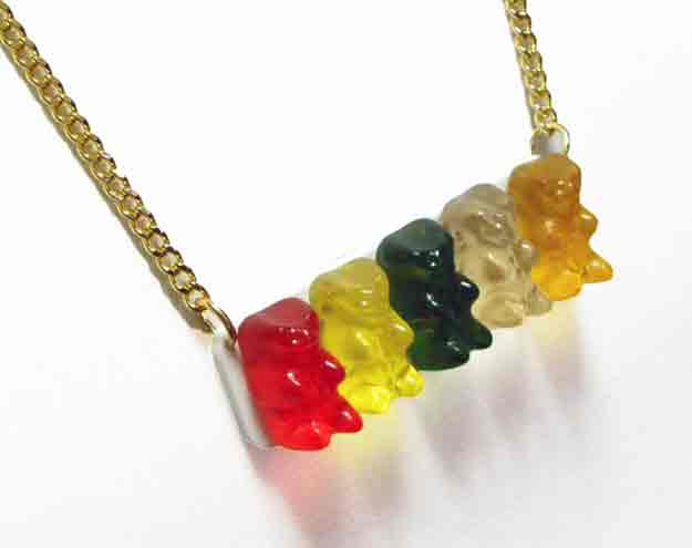 I’m a gummy bear fanatic, so when I saw this jewelry collection, I instantly knew I had to write about it. Gummy bears are no stranger to Bit Rebels. I remember when Richard wrote about the chandelier made out of 5,000 hand strung gummy bears. I wanted one of those for my house, until I called the company and found out that it costs $9,500!