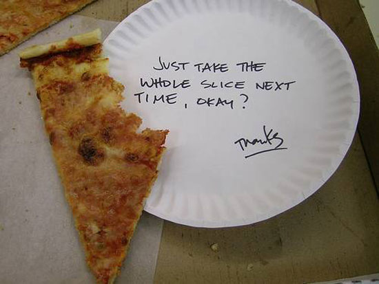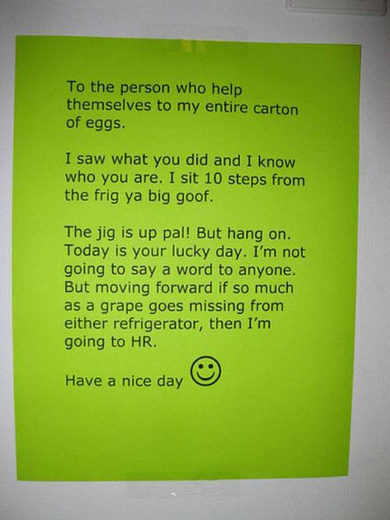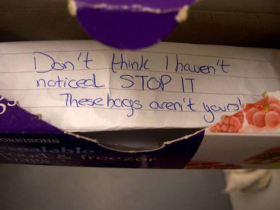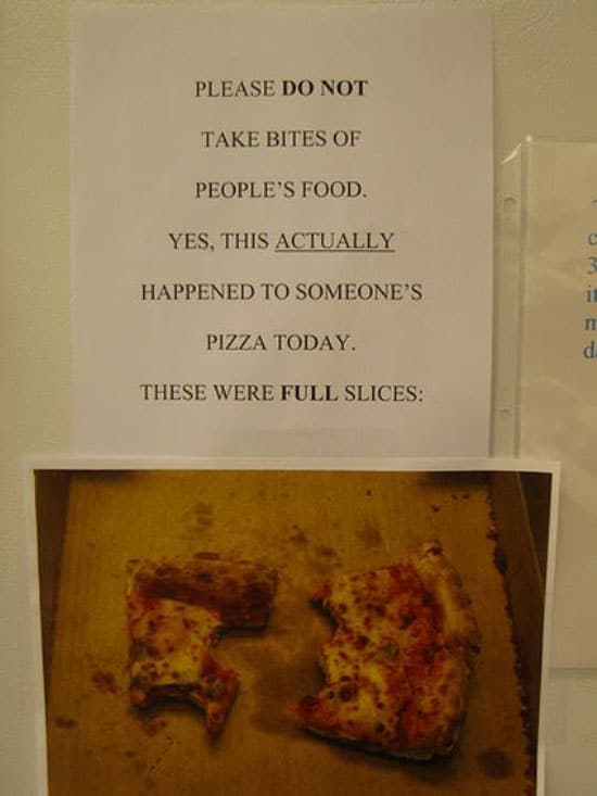 The funniest thing of all is how people act with food in the office. If someone orders pizza, it’s a huge deal and everyone has a party. Meanwhile, if those same people order a pizza at home, it’s no big deal. People also steal and eat each other’s lunches. I know, it’s stupid, but it’s true. I found these pictures below on The Berry. They are such funny examples of how people treat each other in office kitchens. I laughed when I saw these because they brought back so many memories. I hope they give you a good giggle too. Enjoy!