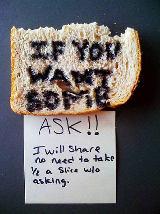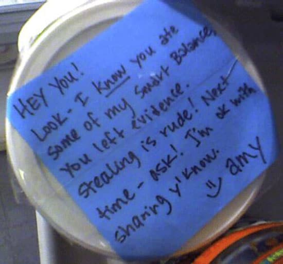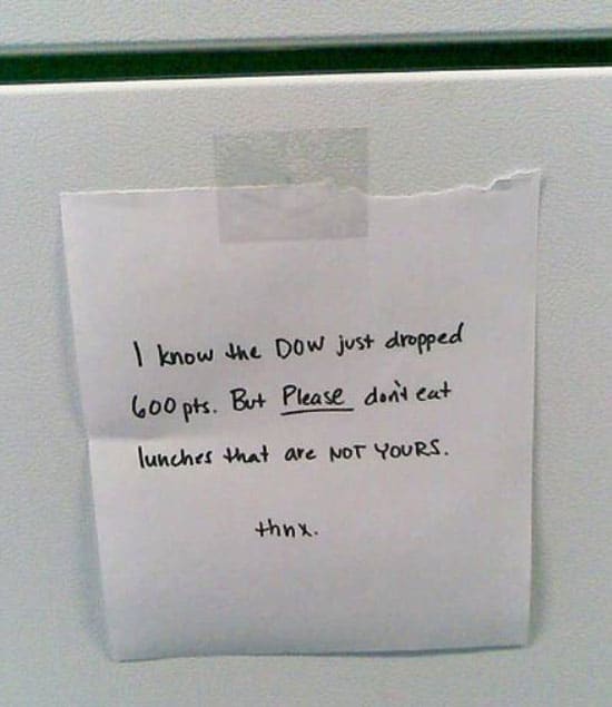 The funniest thing of all is how people act with food in the office. If someone orders pizza, it’s a huge deal and everyone has a party. Meanwhile, if those same people order a pizza at home, it’s no big deal. People also steal and eat each other’s lunches. I know, it’s stupid, but it’s true.  I found these pictures below on The Berry. They are such funny examples of how people treat each other in office kitchens. I laughed when I saw these because they brought back so many memories. I hope they give you a good giggle too. Enjoy!
