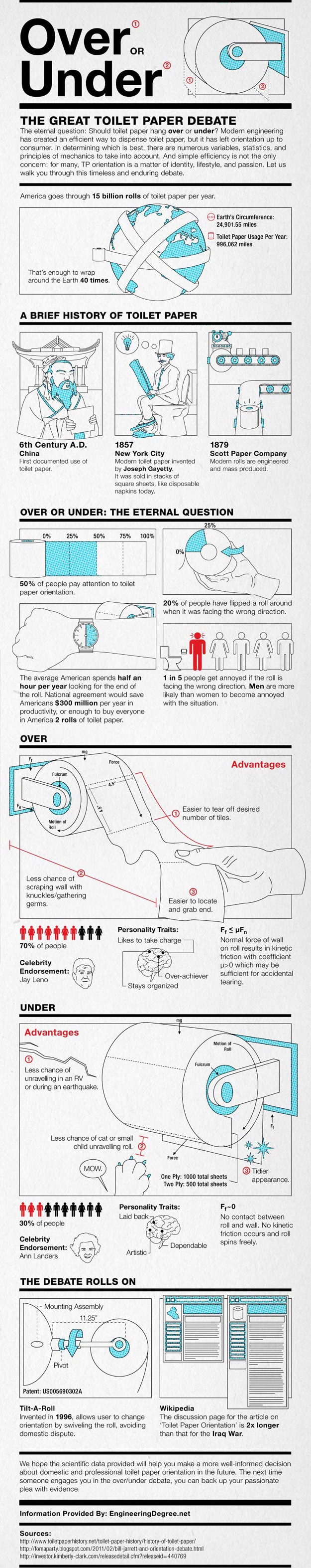 To my surprise, apparently 70% of people think over is the correct way. Considering the fact that this debate on Wikipedia is two times longer than that for the Iraq War, I’m guessing this won’t end any time soon. All I have to say is this… If you come into my house, don’t secretly flip it when you’re in the bathroom or you won’t be welcome there again. #enuffsaid In the meantime, enjoy this infographic that weighs both sides somewhat objectively.
