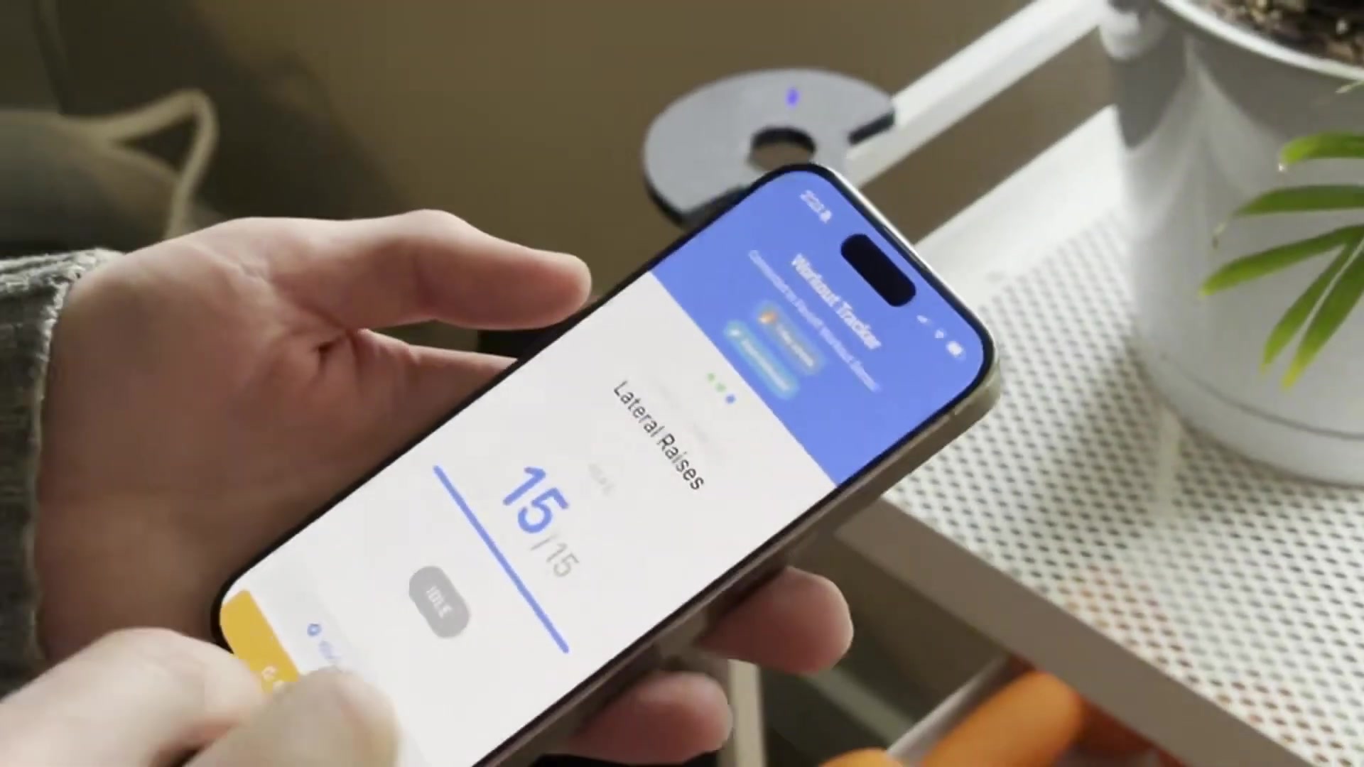 In the demo the tracker behaves like a simple accelerometer-based device: it wakes on motion and sends signals over Bluetooth. That prevents the simplest cheat of telling the phone an exercise occurred without any external physical input. The demo does not show motion classification rules or sensitivity thresholds.