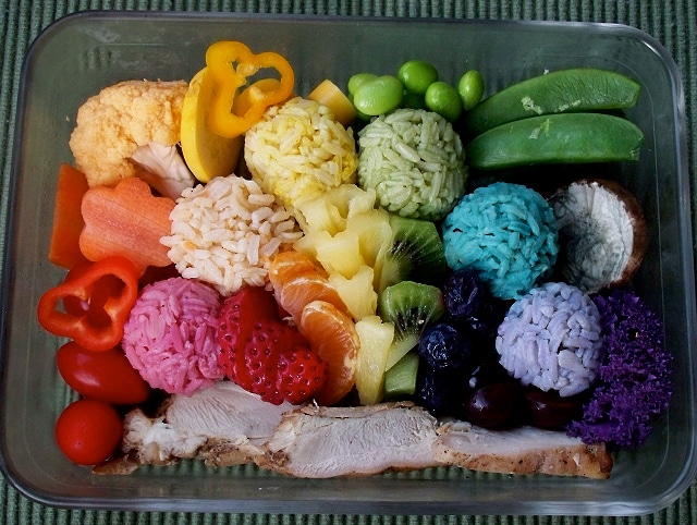Although some of the character-themed bento designs are super fun (and I imagine very time consuming to create), I like the rainbow colored bento best. The things is, it’s hard to get the color blue into a bento design. Think about it. What foods do you know that you might eat for lunch that are blue? There are definitely blueberries, but those can be hard to find. As you see in some of the pictures below, sometimes food coloring is needed to complete the look.