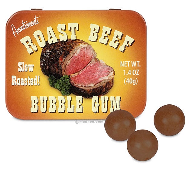 This intrigues me; however, I wonder what exactly they put in it to make it taste like roast beef. At only $3.50 for a tin of 22 gumballs, my guess is, they did not use real roast beef to get that slow-cooked homemade flavor. Normally I chew gum to get fresh clean breath after eating. Hmm… I wonder what kind of breath we’d have after chewing this gum! Eeeww… and it just occurred to me that this gum would be brown in our mouths.