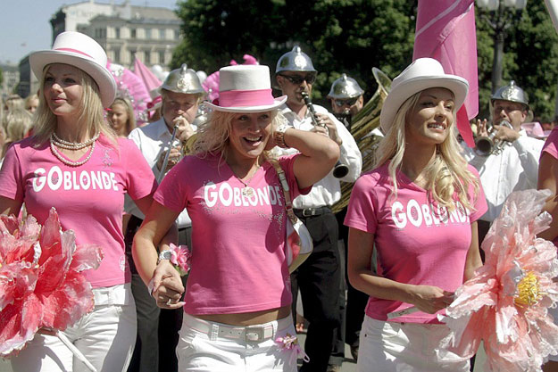 Hundreds of blondes wearing pink and white participated in a very happy “Go Blonde!” parade last weekend. Some of the blondes were natural, some were bleached and some were dark haired women with blonde wigs. It was all in good fun (yay!). This was the second year in a row for this event, which got International attention. They even raised some money for charity, but best of all, the residents of Latvia smiled and forgot their troubles for the day despite the gloomy times they’ve experienced recently.