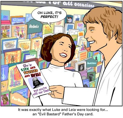 I guess it was only a matter of time before someone came up with a way to incorporate Star Wars into the Father’s Day celebration. It’s not exactly the first thing you think about when it is close to Father’s Day, but it’s one of the most hilarious one panel comics I have seen all week. If you think about it, what would you give Darth Vader if you had that heavy breathing maniac as your father?