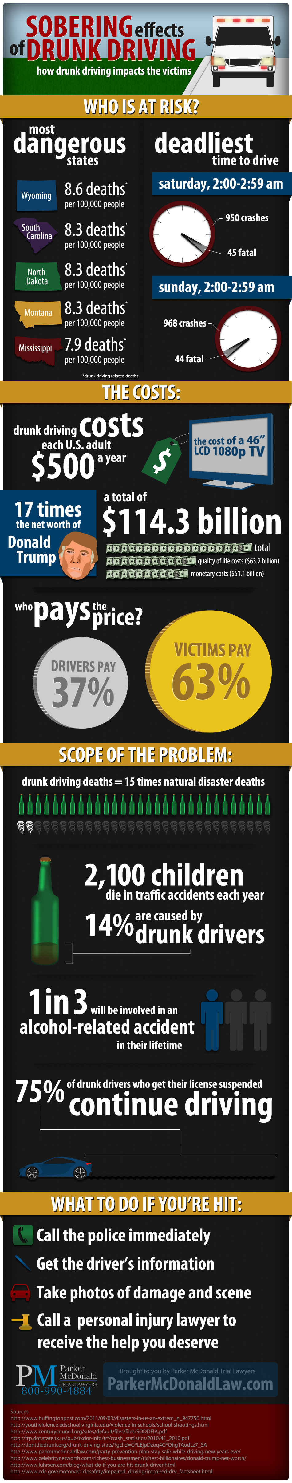 According to Insure.com, in 2010, 158 people died in the United States due to alcohol-related crashes on Memorial Day weekend. That doesn’t include the hundreds more that were injured due to these crashes. This infographic, called “The Sobering Effects of Drunk Driving,” gives an overview of the devastating effects drunk driving has each year. Remember, if you’re going to drink this weekend, talk to the person who’s hosting the party. Make sure you’re welcome to sleep over if you’re not able to drive or get a cab. You could save your life or someone else’s by not getting behind the wheel drunk.