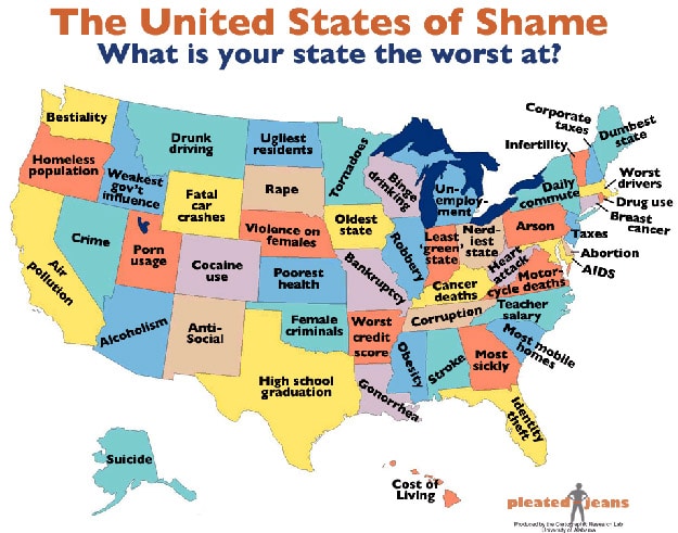 These little maps of the United States of Awesome and the United States of Shame are a fun way to waste five minutes. Now you can see what your own state is best at and worst at. I wouldn’t put too much value in this though; it’s only for fun. I can’t help but wonder how much of this is just cause and effect. For example, I wonder what the population of New Mexico is. Perhaps they are just listed as most “anti-social” because there aren’t as many people there, who knows, right?