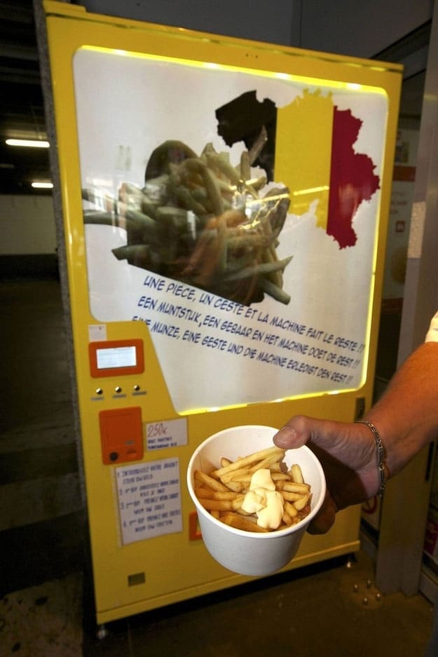 For just €2.50 (about $3.30), the people in Chaussee de Gand-Steenweg op Gent in Brussels can get a perfect portion of fresh french fries at any time. You can choose either ketchup or mayonnaise to complement your fries when they’re done cooking. Since the machine uses beef fat to fry them, they come out crunchy and perfect every time. My mouth is watering just writing about this.