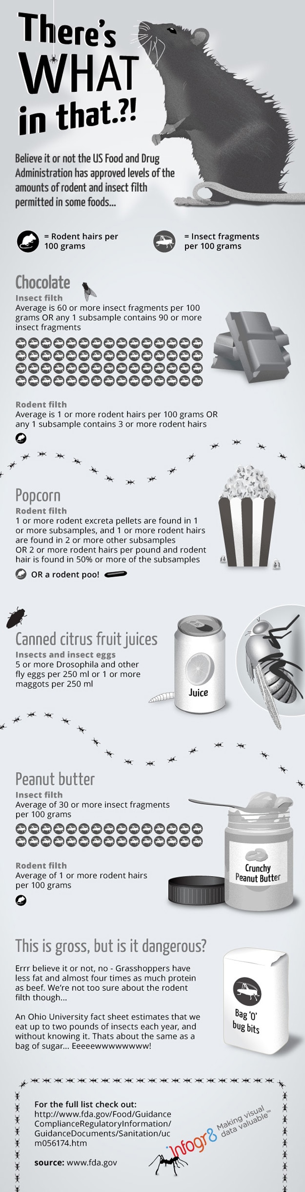 Infogr8 took all the complicated terminology off the government website and compiled into a simple infographic for us all. The bottom line is…Yup, we are eating some pretty disgusting stuff in our chocolate, popcorn, canned citrus fruit juices, peanut butter and more. When you started to wonder what is really in food, did it ever occur to you that it could be rodent hairs and insect fragments? I mean, when I think about what is really in food, I think more of dust and dirt, not evidence of rats and bugs.