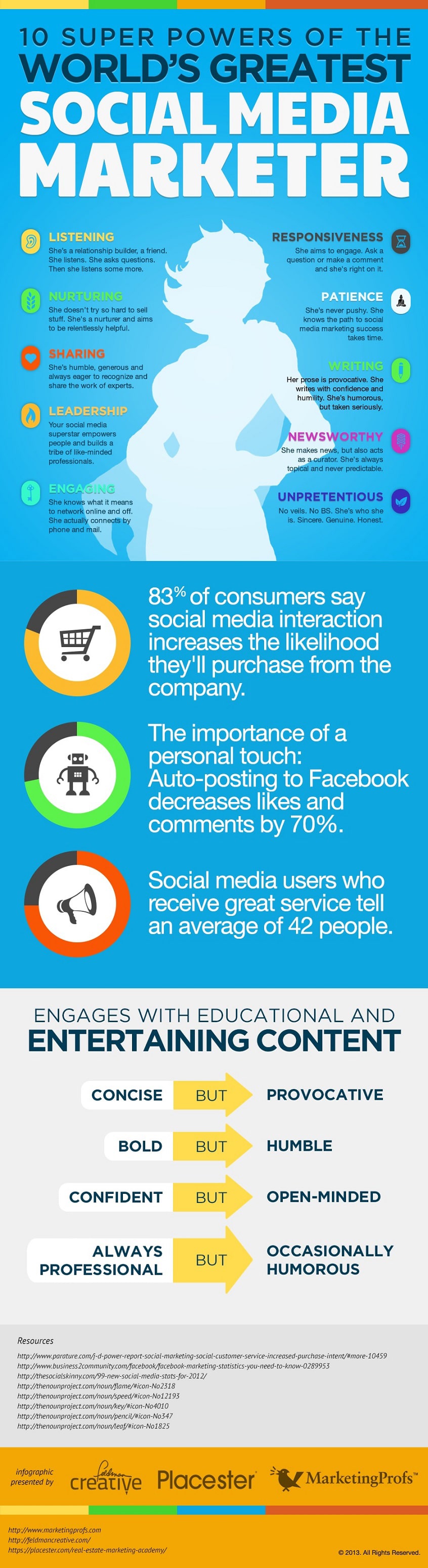I think this infographic called 10 Super Powers Of The World’s Greatest Social Media Marketer (based on Meet The World’s Greatest Social Media Marketer) explains it well. If you want to become a great social media marketer, you’ll want to develop these 10 super powers.