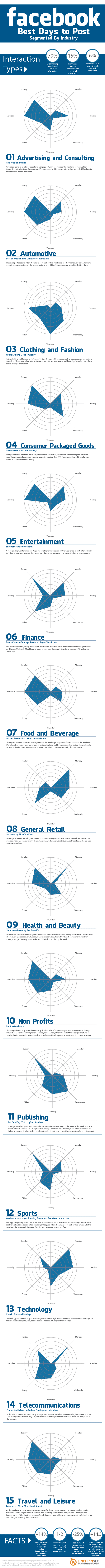 Trying to compile one of these content oriented guides yourself would probably take a lot of work and time, which is not a very optimized solution if you have a busy schedule and are trying to make your brand successful. Instead, let’s just use the awesome infographic that LinchpinSEO put together for us instead. It is called Facebook: Best Days To Post – Segmented By Industry and is one of the more extensively researched content oriented posting guides I have seen so far.