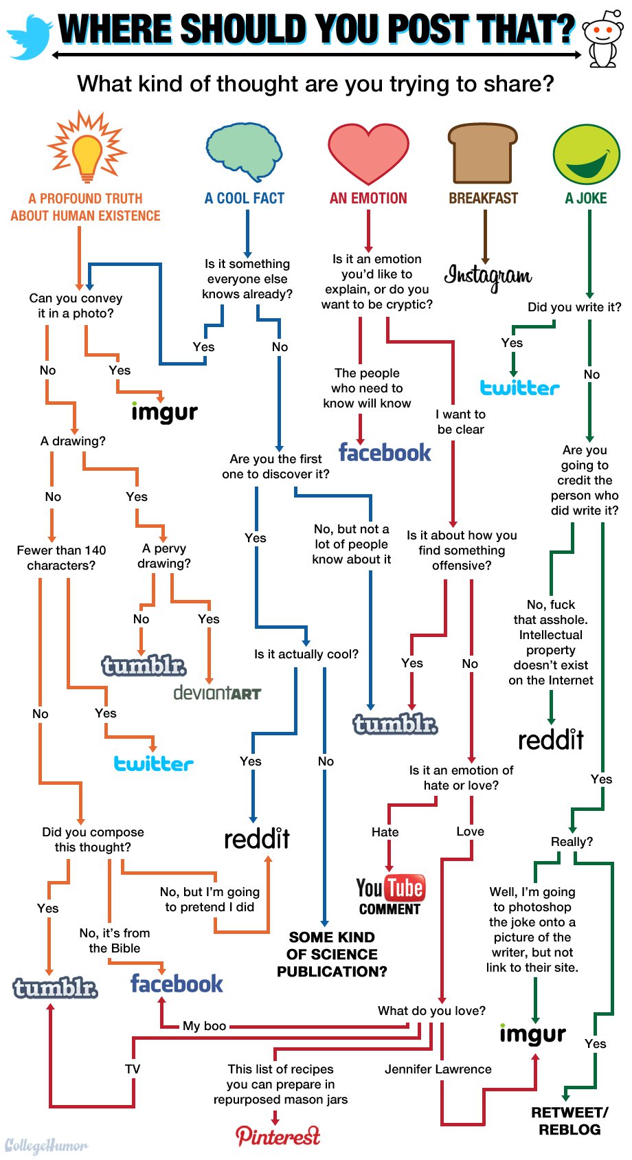 If you are serious about your social networking, doing the necessary research is of course encouraged. But if you’re looking for a quick fix in order to ramp up your efficiency and social media efforts, then you should just consult this flowchart guide that will tell you exactly where to post your stuff. It’s called Where Should You Post That? and is presented by CollegeHumor.
