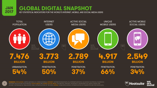 According to Digital in 2017 Global overview report, there are 3.77 billion global internet users in 2017 or 50% penetration and 2.80 billion global social media users equaling 37% penetration.  In other words, almost half of the total world population are internet and active social media users.
