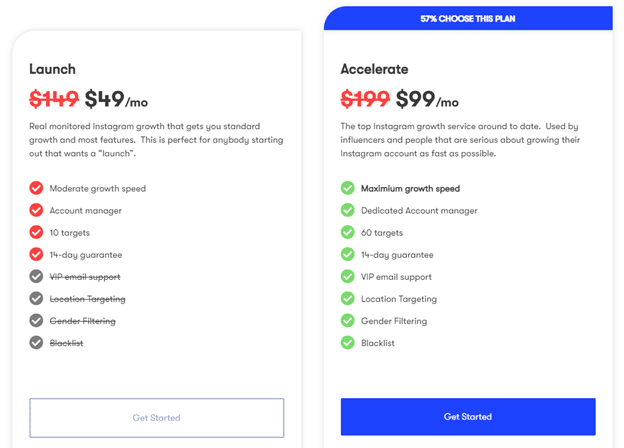 Much like Growthoid, Growthsilo offers two different pricing packages, both at alleged discounted rates. They claim that it is “the top Instagram growth service around to date”. Their packages are Launch @$49 a month, and Accelerate @£99. Kinda pricey when you know that all you’re going to get for that is a bunch of bots and fake accounts, right?!