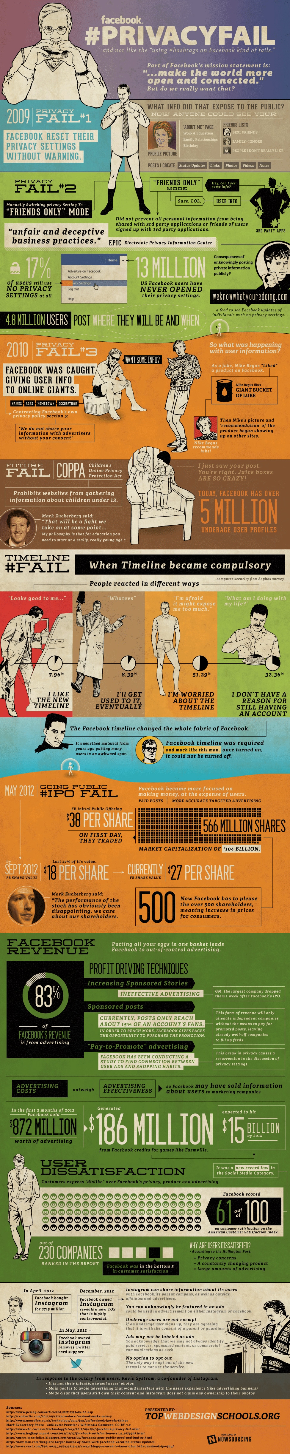 Gone are the days when people will look for their “15 minutes of fame” and instead they’ll want their “15 minutes of privacy.” In this infographic called Facebook #PrivacyFail by TopWebDesignSchools.org, you’ll get to see the history of Facebook privacy fails and how people reacted to those. It will be fun in the future when instead of looking at the history of Facebook privacy fails, we look at the history of reestablishing our privacy. Although some people say we’ll never be able to go back, I think we will. Only time will tell.