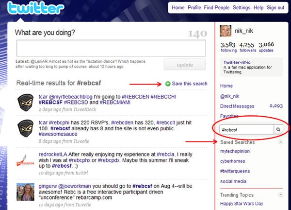 Saved searches are a very cool feature that allows you to keep current on certain topics. You can create a search on your Twitter home page for any keyword or hashtag. Then, there is a little green button that reads, “save your search.” If you click that, your search will be saved right there on your page for you to access whenever you like. It is kind of like tweevesdropping on people’s conversations which allows you to stay up to date. Thanks @nik_nik for this illustration below.